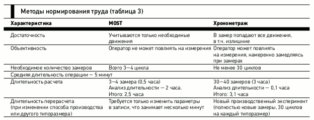 В отличие от хронометража, микроэлементное нормирование — МЭН (отечественная БСМ и зарубежные MTM-1, MTM UAS и MOST, см. табл. 3) позволяет получить объективные результаты нормирования, не искаженные влиянием работника и нормировщика, требует меньших трудозатрат на проведение измерений и анализ данных. Более того, МЭН помогает искать возможности для оптимизации деятельности компании.