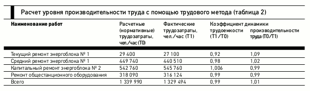 Трудоемкость является величиной, обратной производительности труда. Чем меньше фактическая трудоемкость, тем выше производительность труда. Пример расчета производительности труда на условном филиале ремонтного предприятия приведен в табл. 2.