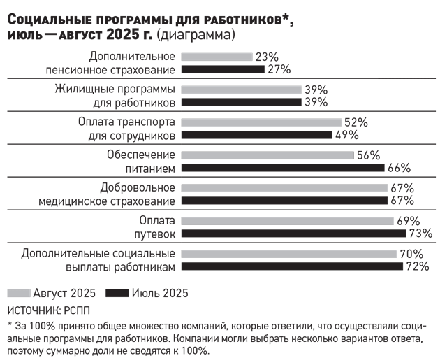 Социальные программы для сотрудников имелись в 86,1% организаций, а инициативы, направленные на поддержку других категорий граждан, реализовали в 58,3% компаний. Программы для сотрудников включали выплату дополнительных средств, не предусмотренных трудовым законодательством (70,2%), оплату путевок на санаторно-курортное лечение и детский отдых (69,1%), добровольное медицинское страхование (67%), обеспечение работников питанием (56,4%), оплату транспорта или доставку на работу (52,1%), жилищные программы, включая ипотеку (39,4%), а также дополнительное пенсионное страхование (23,4%).