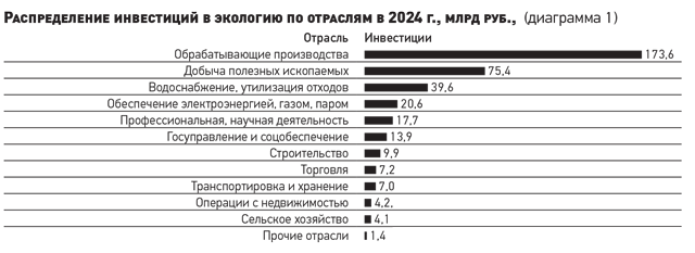 Сокращение объема «зеленого» инвестирования было зафиксировано в нескольких ключевых отраслях. Наибольшее снижение показала сфера профессиональной, научной и технической деятельности, где инвестиции упали на 22,7% (–5,2 млрд руб.). Также значительное сокращение произошло в строительстве: –18,8% (–2,3 млрд руб.); энергетике: –4% (–868,6 млн руб.); добыче полезных ископаемых: –2,9% (–2,3 млрд руб.); обрабатывающих производствах: –0,4% (–698,9 млн руб.). Примечательно, что, несмотря на снижение экологических инвестиций, сам обрабатывающий сектор в 2024 г. продемонстрировал общий рост на 8,5%.