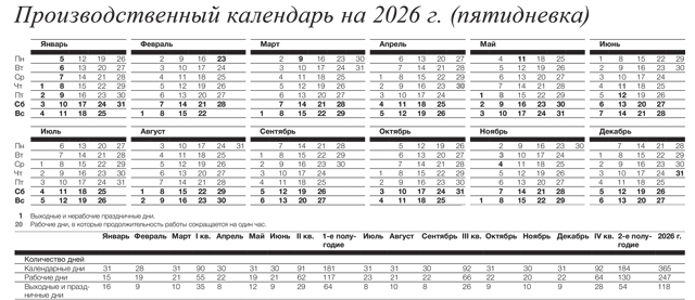 Производственный календарь — это ключевой инструмент для расчета заработной платы, составления графиков, планирования отпусков, сдачи отчетности. Предлагаем производственный календарь на 2026 г. для пятидневной рабочей недели, составленный с учетом постановления Правительства РФ от 24.09.2025 № 1466, утвердившего перенос выходных дней в 2026 г.